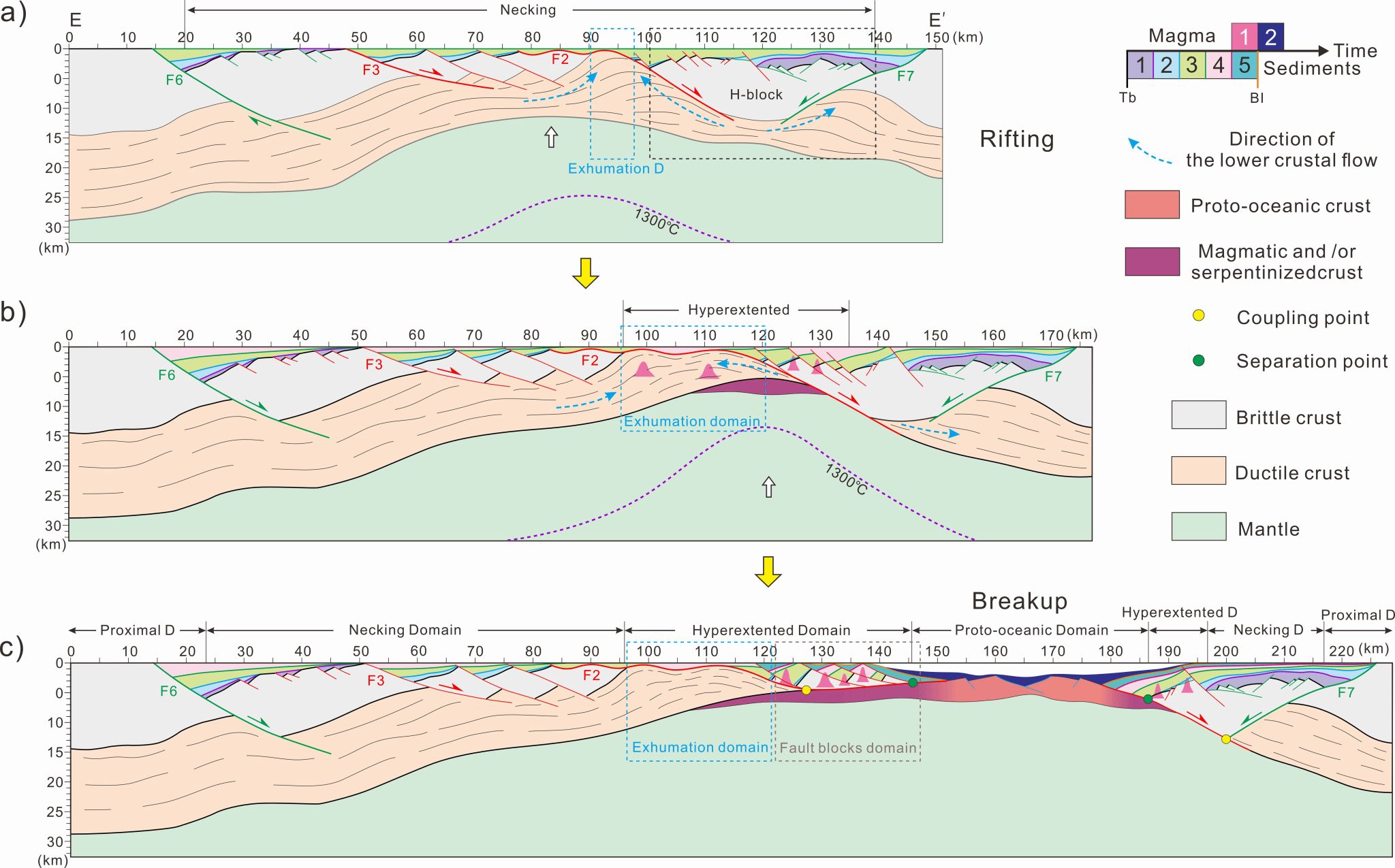 团队基于高分辨率地震资料的精细解释,发现琼东南盆地内发育一系列拆离断层及其伴生的变质核杂岩,后者呈现自东向西的递进迁移规律(图1),阐明了变质核杂岩的发育直接驱动了地壳的强烈减薄。在此基础上,团队构建了新的演化模型,提出“热—弱”地壳的伸展变形经历了从早期韧性下地壳主导的“非耦合”状态,到后期应变集中于上盘脆性层的“耦合”状态的转变(图2)。在持续伸展作用下,下地壳韧性物质向拆离断层下盘流动、汇聚并上涌,形成变质核杂岩,随着韧性层被抽离殆尽,变形模式的转换最终导致地壳强烈减薄乃至完全破裂。