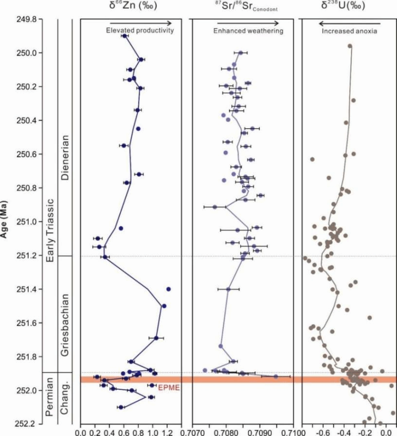 如图所示,CIA的正漂与牙形石Sr同位素的高值指示大陆风化作用在二叠纪末显著增强,从而触发海洋初级生产力的提高,最终造成海洋的缺氧和生物的绝灭。在生物大绝灭后的短暂恢复期(H. parvus 牙形石带),碳酸盐岩δ66Zn的升高与牙形石87Sr/86Sr的下降同步,指示了灭绝事件之后一个短暂的风化减弱期,这与该时期草莓状黄铁矿数量减少以及U同位素正漂所记录的全球海洋缺氧程度的减弱相对应。