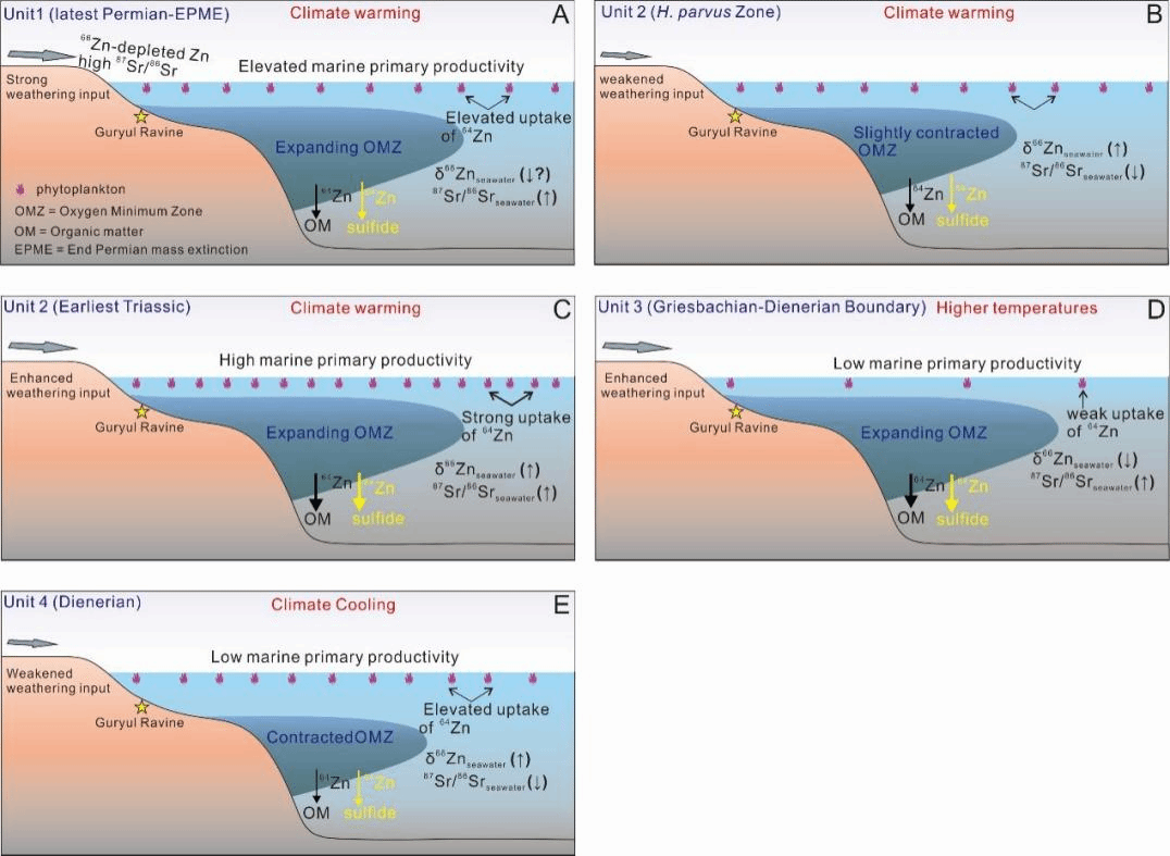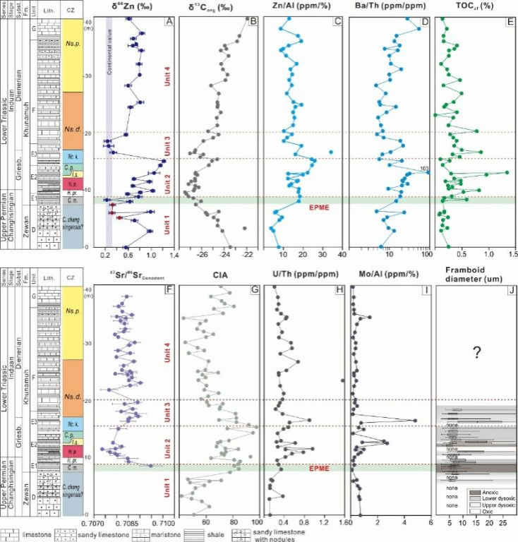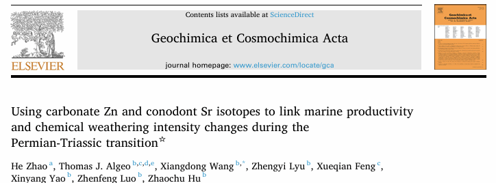 He Zhao, Thomas J. Algeo, Xiangdong Wang, Zhengyi Lyu, Xueqian Feng, Xinyang Yao, Zhenfeng Luo, Zhaochu Hu., 2026. Using carbonate Zn and conodont Sr isotopes to link marine productivity and chemical weathering intensity changes during the Permian-Triassic transition. Geochimica et Cosmochimica Acta. //doi.org/10.1016/j.gca.2026.03.027.
