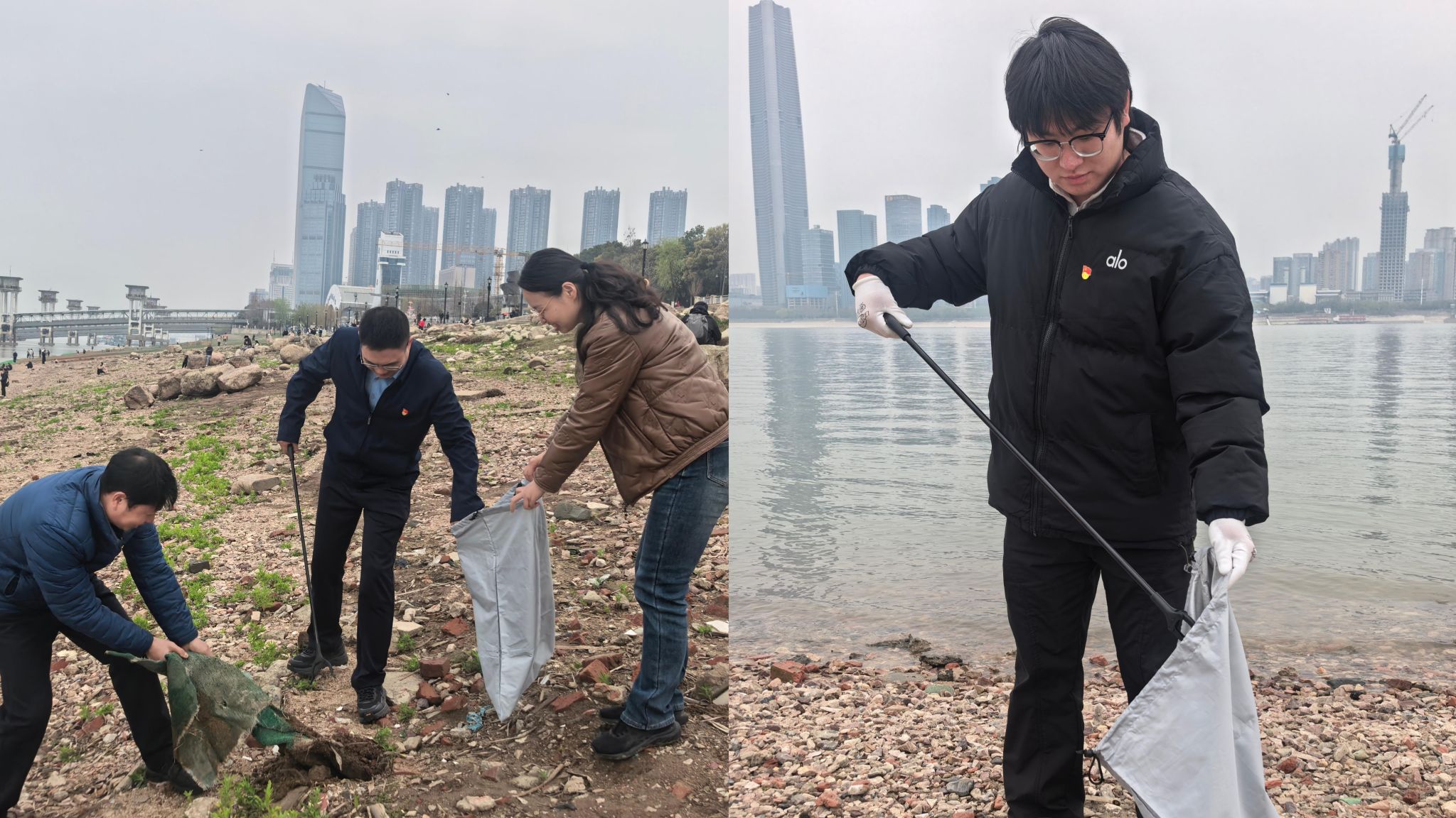 专题学习结束后,全体师生党员奔赴江滩开展 “垃圾清零30平”志愿服务活动。大家手持垃圾袋、垃圾夹,分工协作、认真捡拾江滩上的塑料瓶、塑料袋、烟头、纸屑等各类垃圾。劳动中,党员们不怕脏、不怕累,以实际行动清理江滩环境,用双手守护长江岸线的整洁。