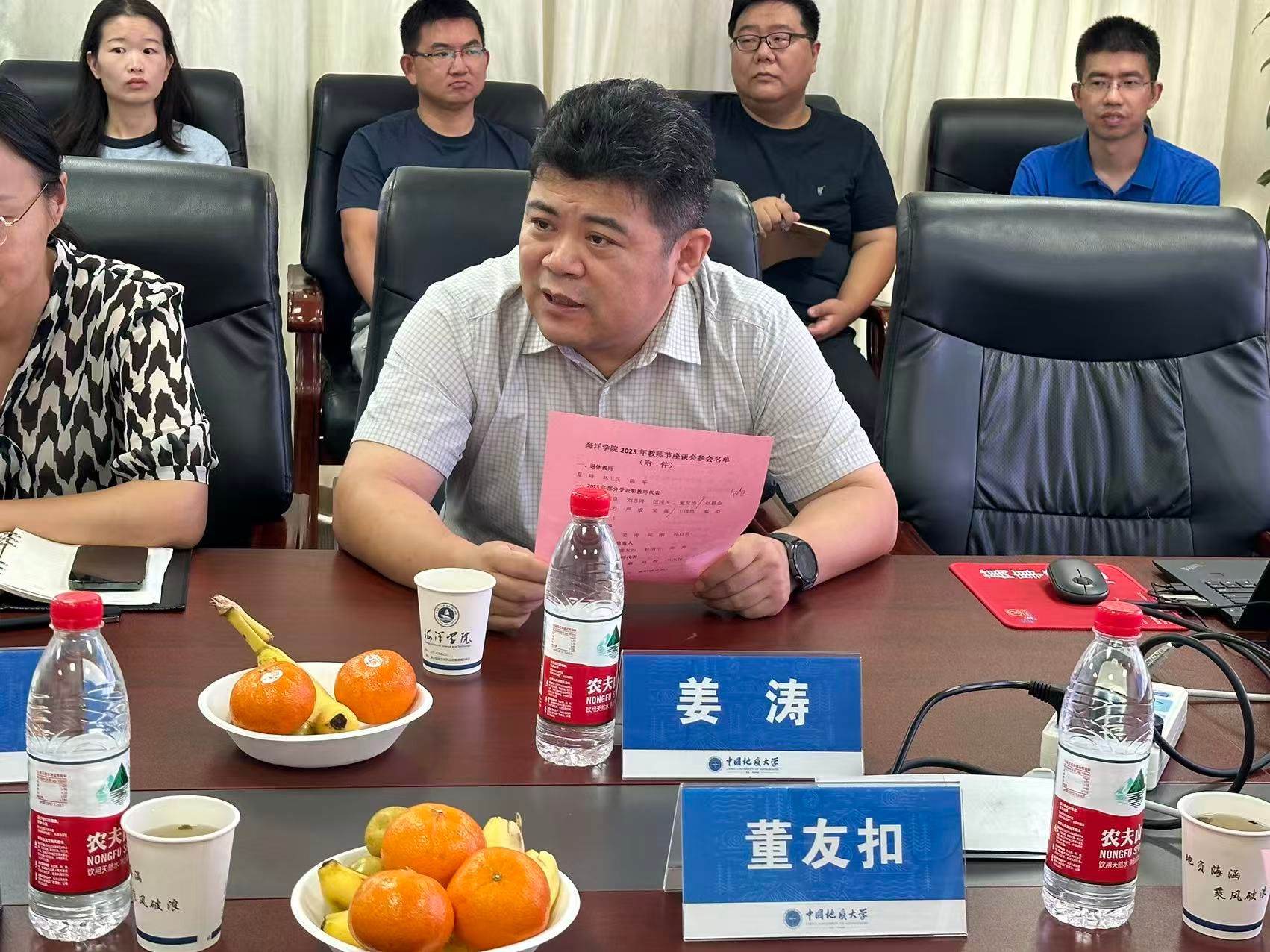 教师代表发言。“荆楚楷模”和“楚天名师”陈刚、国家重点研究计划及国家自然科学基金优秀青年项目负责人孙启良、“海洋强国青年科学家”赵恩金教授、指导团队分别获全国油气地质大赛本科生和研究生单项组一等奖的刘恩涛教授、赴南极科考的严威副教授、指导学生获中国国际大学生创新大赛金奖的涂海文副教授、指导学生获湖北省第十五届“挑战杯”二等奖的匡洋民副教授、全校优秀辅导员陈波等教师围绕海洋学科特色育人实践、产教融合、科研协同创新及教育教学数智化转型、思想政治教育工作等方面进行分享。大家结合海洋强国战略需求,重点交流了将海洋实践融入课堂教学、联合科研院所推进产学研协同育人经验做法,强调要以“知海爱海兴海”为主线,深化三位一体培养模式,将海洋生态保护、深海资源勘探等国家战略需求转化为育人资源。