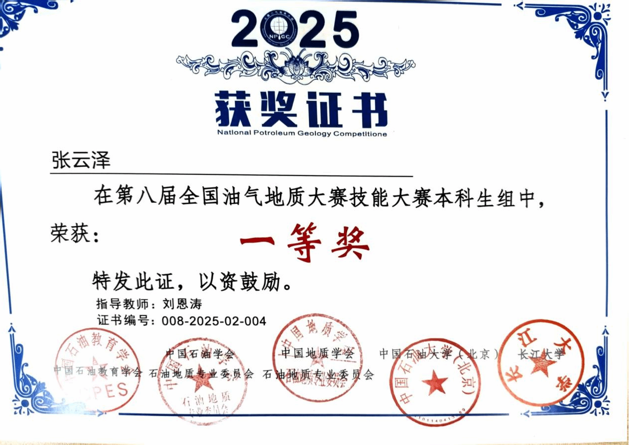 在科研领域,张云泽从不甘落后。他作为主要成员参与两项国家级大学生创新创业训练计划项目并成功结题,将课堂所学转化为实践成果;竞赛中,他斩获全国油气地质大赛一等奖、全国智慧海洋大数据应用创新大赛优胜奖等荣誉,用实力证明了科研能力。这些探索不仅提升了他的专业素养,更培养了他团队协作与解决问题的能力。