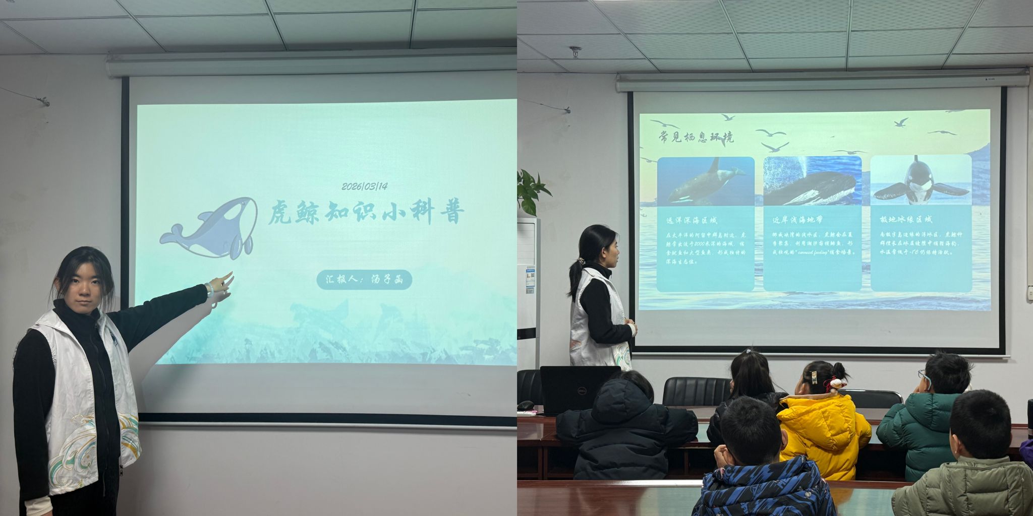 活动现场,志愿者汤子函化身 海洋科普讲解员,围绕海洋生物虎鲸的生活习性、分布范围等内容,用通俗易懂的语言、生动鲜活的案例,揭开虎鲸的神秘面纱。中间插入与保护虎鲸相关的问题,激发小朋友的对海洋生物保护的思考