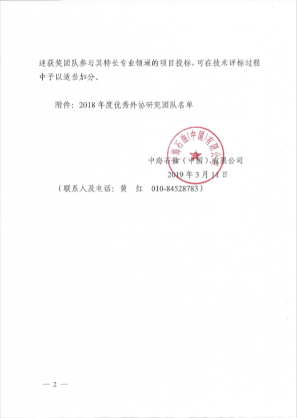 2018年底至2019年2月,中海石油(中国)有限公司勘探部分批次组织地质、物探、作业、重大专项等专业外协技术交流,各单位选出63个外协团队参与交流,经过勘探风险委专家、公司勘探专家严格评审,从63个外协团队中评选出了9个优秀外协研究团队。