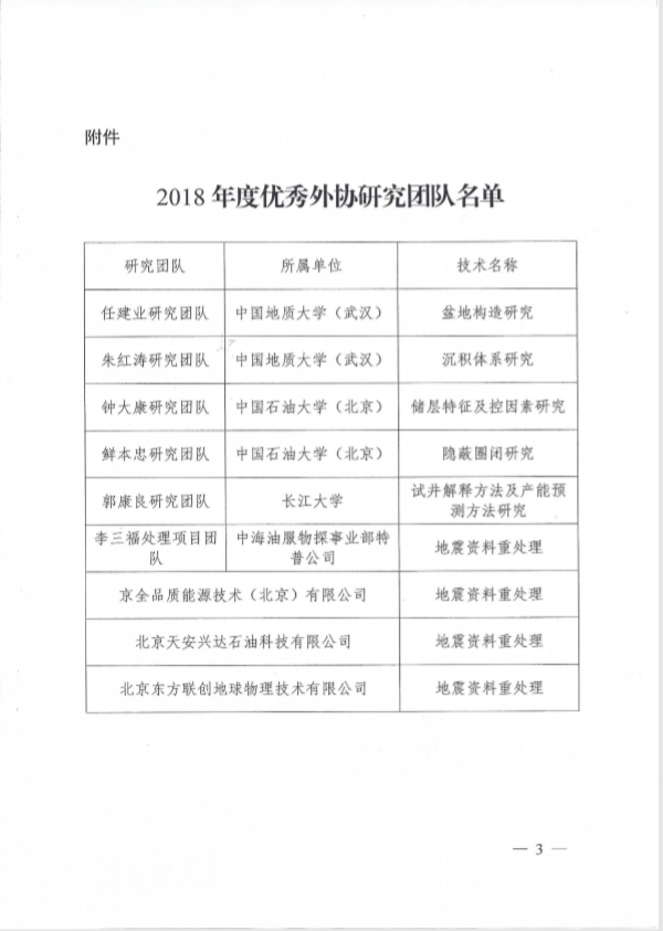 任建业教授研究团队获评勘探领域2018年优秀外协团队。