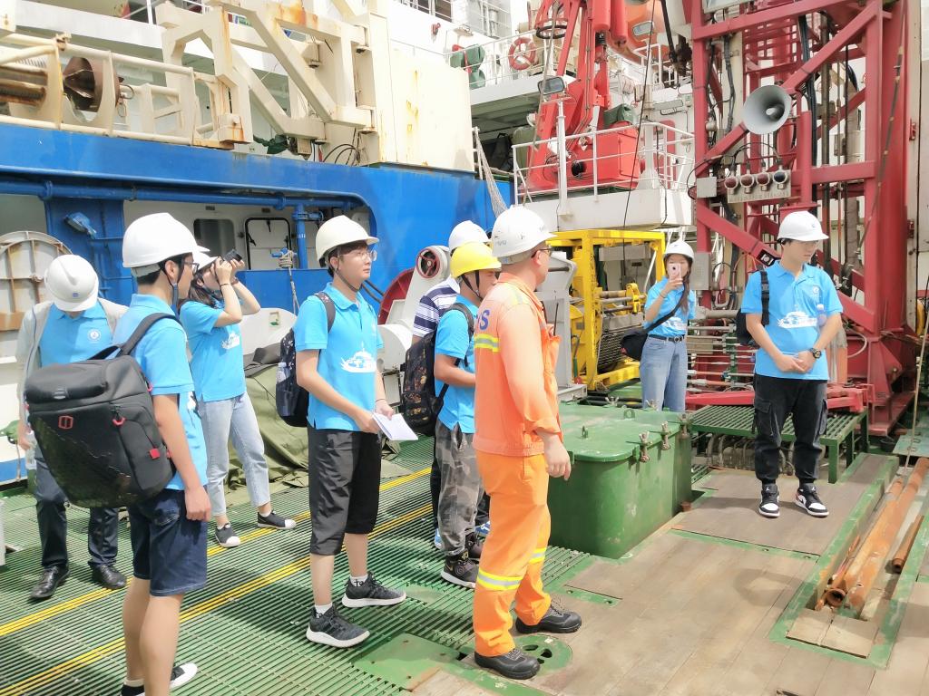 在殷机长和胡船长的带领下,队员们第一次登上科考船,第一次见船载钻探系统,第一次进入科考船的轮机室,第一次在船上餐厅吃饭……实践团队员们体验了海洋人真实的一天生活。在与殷机长的座谈中,队员们了解到,1984年我国拥有的第一艘地质调查船——探宝号,是一艘在美国已经服役15年淘汰的科考船,载重1200吨,可是在当时,探宝号已经是国内最先进的科考船。30多年来,我国海洋事业不断发展,我国如今已经自主研发设计了可集海洋地质,地球物理,物理海洋,海洋生物,海底钻探,水文调查等多手段综合调查,先进的深海浅层钻探系统以及可视化取样等设备,形成底层水体,海底表面,以及海底浅层的立体综合探测体系。从进口发达国家废弃旧船,到自主研发的海洋十号,再到即将建成的为建党100周年献礼的近4万吨水合物开采船,队员们看到了几代海洋人为我国海洋事业做出的巨大贡献,看到了改革开放以来我国的海洋建设事业迅速的发展和进步。