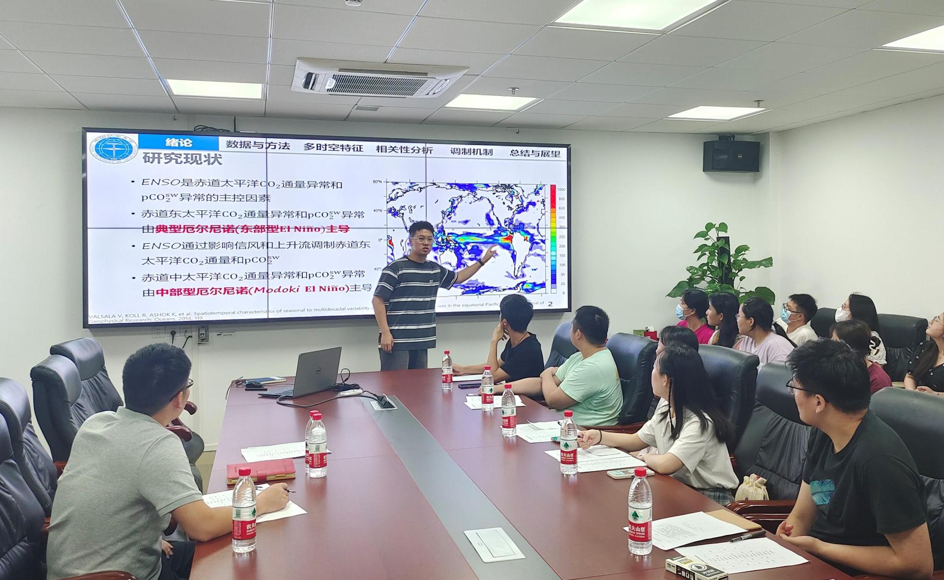 姜正同学(2018级本科生)的汇报主题是热带太平洋海表二氧化碳分压对气候背景场的物理响应,展现出了极高的创新特色,并且完美交流和回答了海洋和陆地每年吸收和释放二氧化碳的比例等问题。