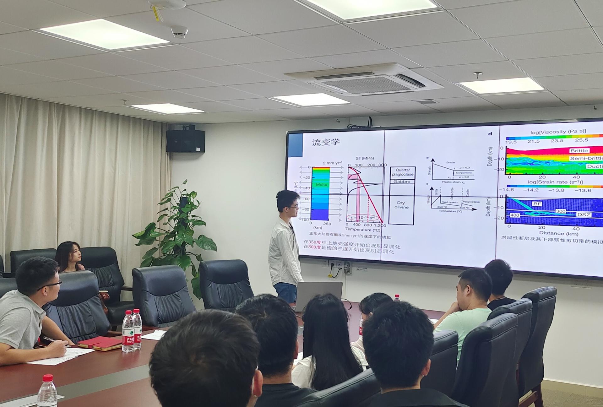 杨天一同学(2021级研究生)的汇报主题是伊比利亚-纽芬兰被动大陆边缘。与同学们交流了韧性层随深度的变化等问题。