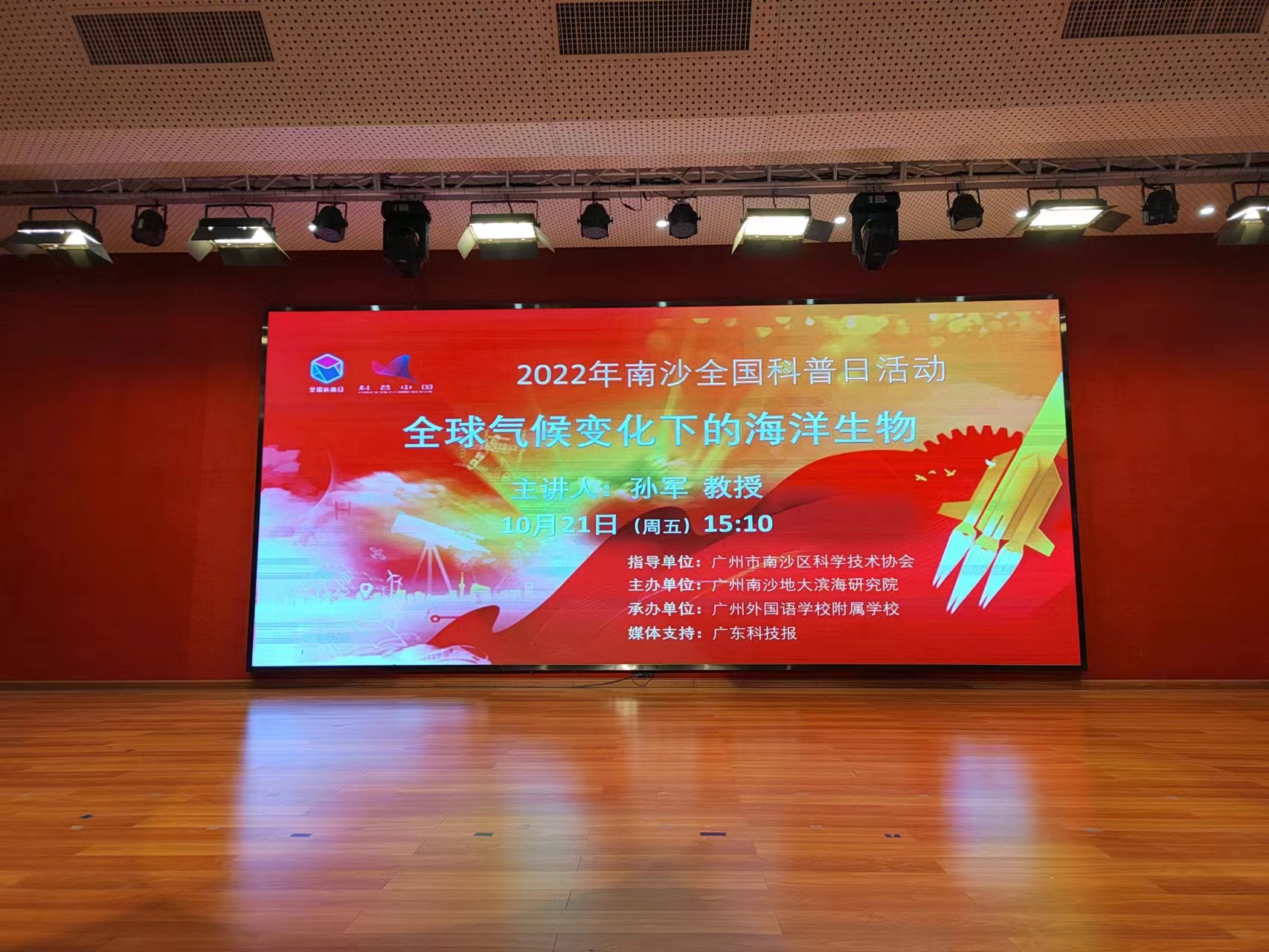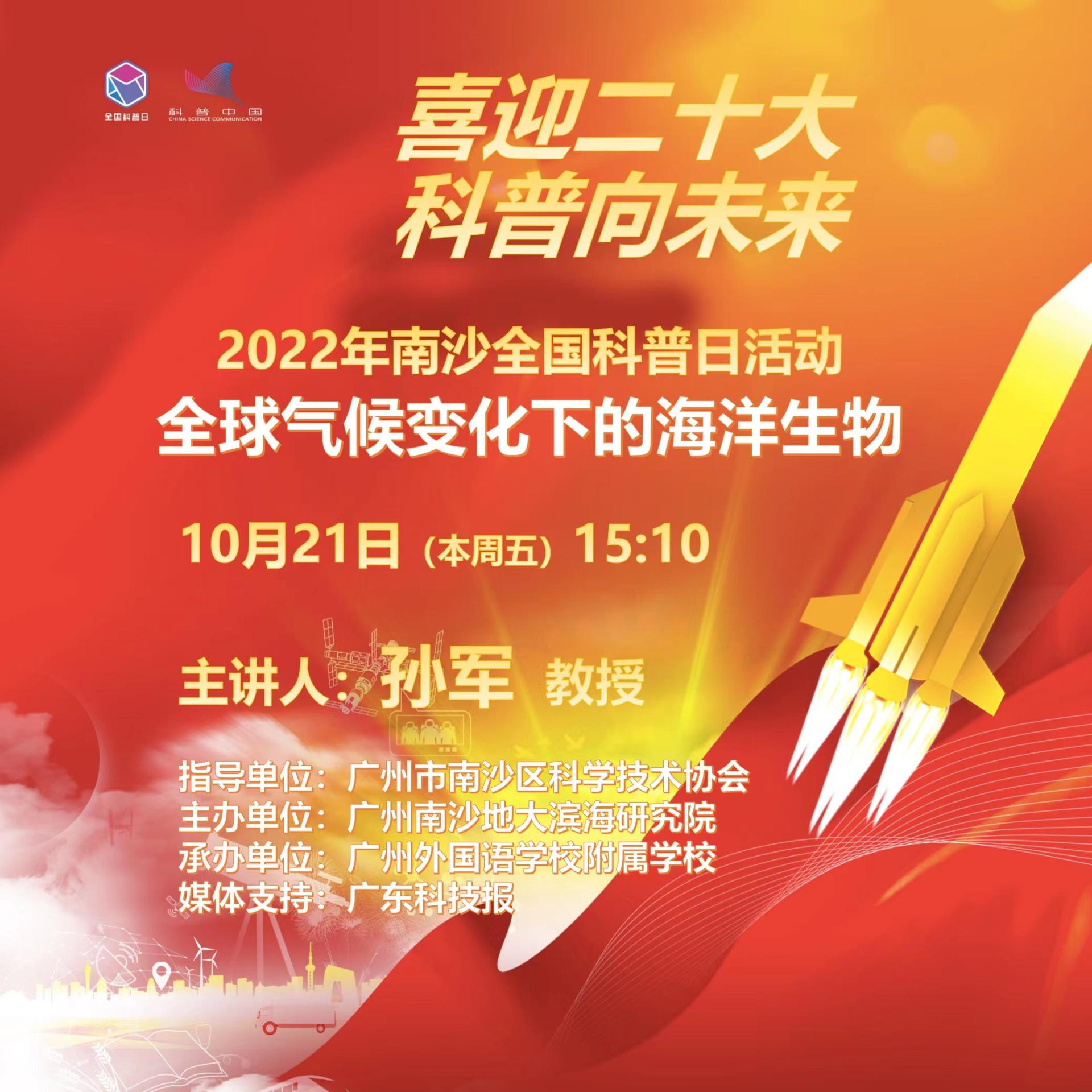 孙军教授作为主讲嘉宾参加以“喜迎二十大,科普向未来”为主题的2022年南沙全国科普日活动,并带来一场以“全球气候变化下的海洋生物”为主题的科普报告。