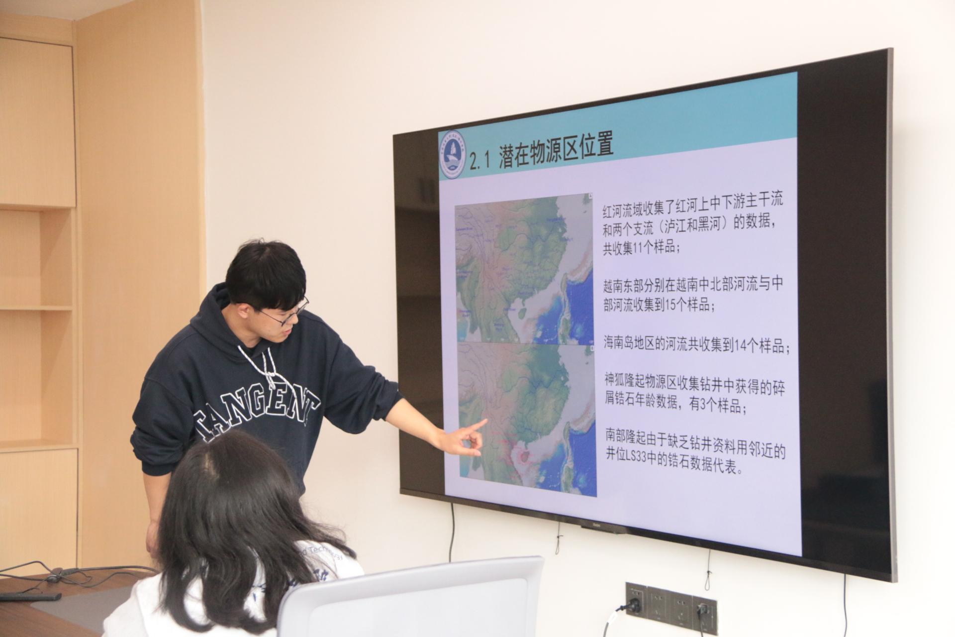 与广州海洋地质调查局联培的夏安康,张雨斐、孟小暄、戴炜力、伍永林、王坤、阎少妮、王世勋八位研究生同学分别就《海洋溶解甲烷及其海气交换通量研究进展》、《南海北部硫酸盐-甲烷转换带深度变化的运动机制调研》、《菲律宾海铁锰沉积物地球化学分析及讨论》、《海南岛三亚湾与红塘湾砂质海岸岸滩变化特征》、《对基于波动方程的模型正演》、《琼东南盆地晚渐新世-中中新世物源演化》、《琼东南盆地第四纪块体搬运沉积(MTD)的沉积特征、控制因素及其与水合物藏的关系》、《海洋碳封存及应用前景》展开了汇报。同学们精神饱满、思路清晰,向与会师生详细讲解了各自的海洋研究课题与成果,并与参会同学展开热烈讨论。