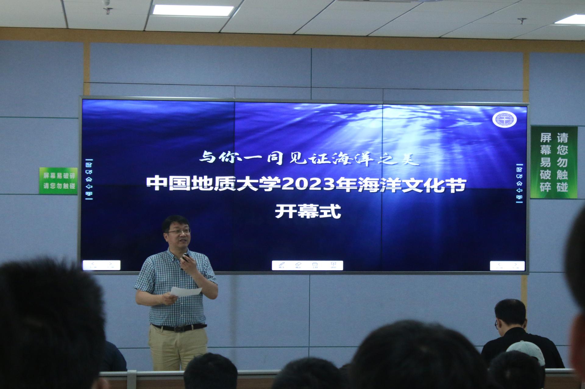 副院长宫勋介绍开幕式讲座嘉宾。他表示,希望通过“科海扬帆,筑梦深蓝”海洋文化节系列科普讲座的开展,不断拉近师生与蔚蓝海洋的距离,共同提升我们保护海洋的意识。
