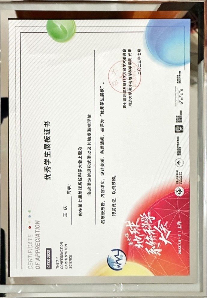 (武汉)唯一获奖学生。他的报告题为“海底滑坡的退积式滑动及其触发海啸评估”,由孙启良教授指导。