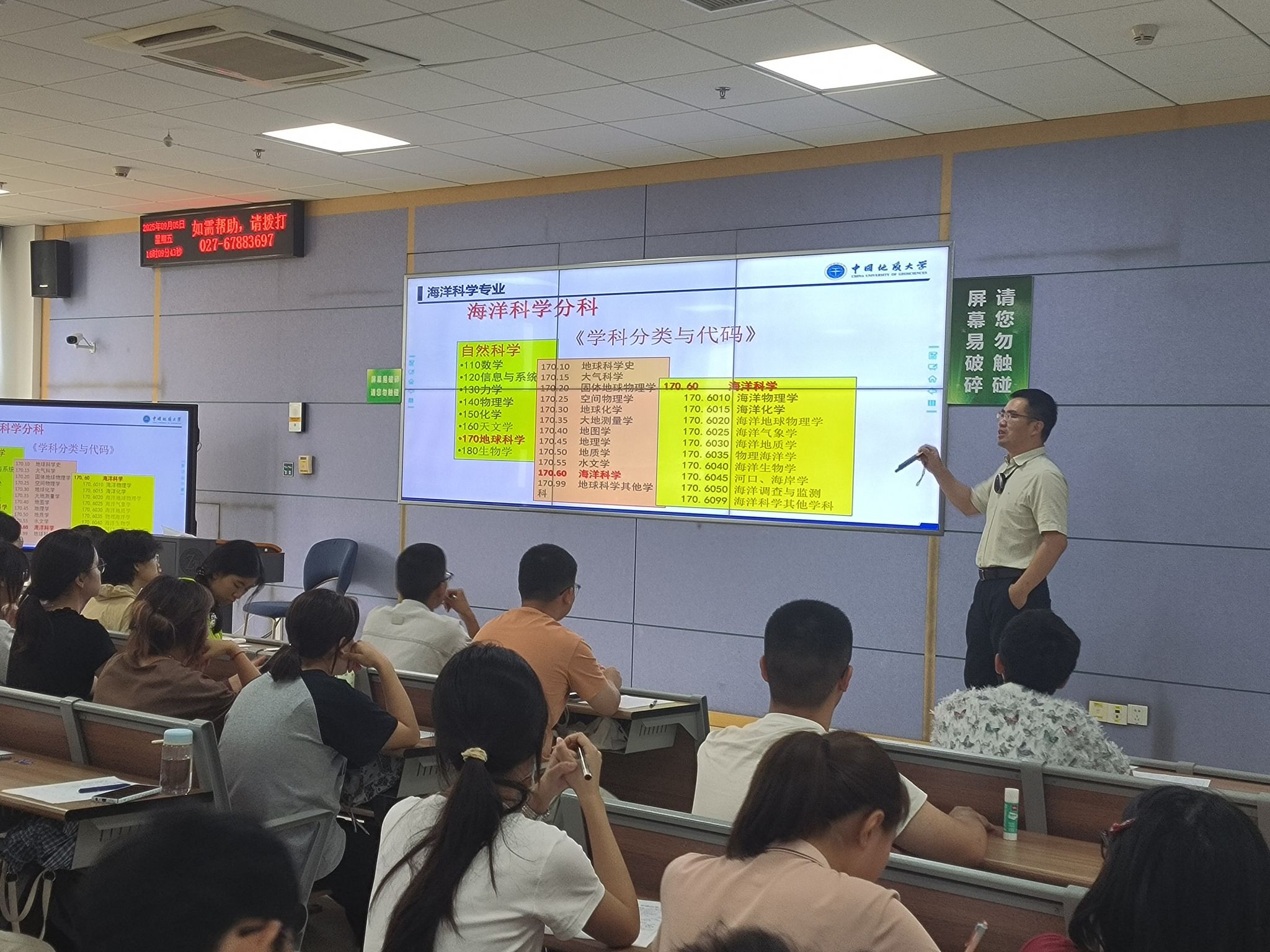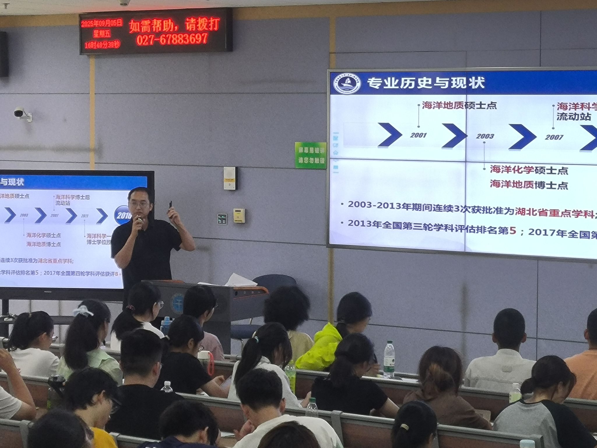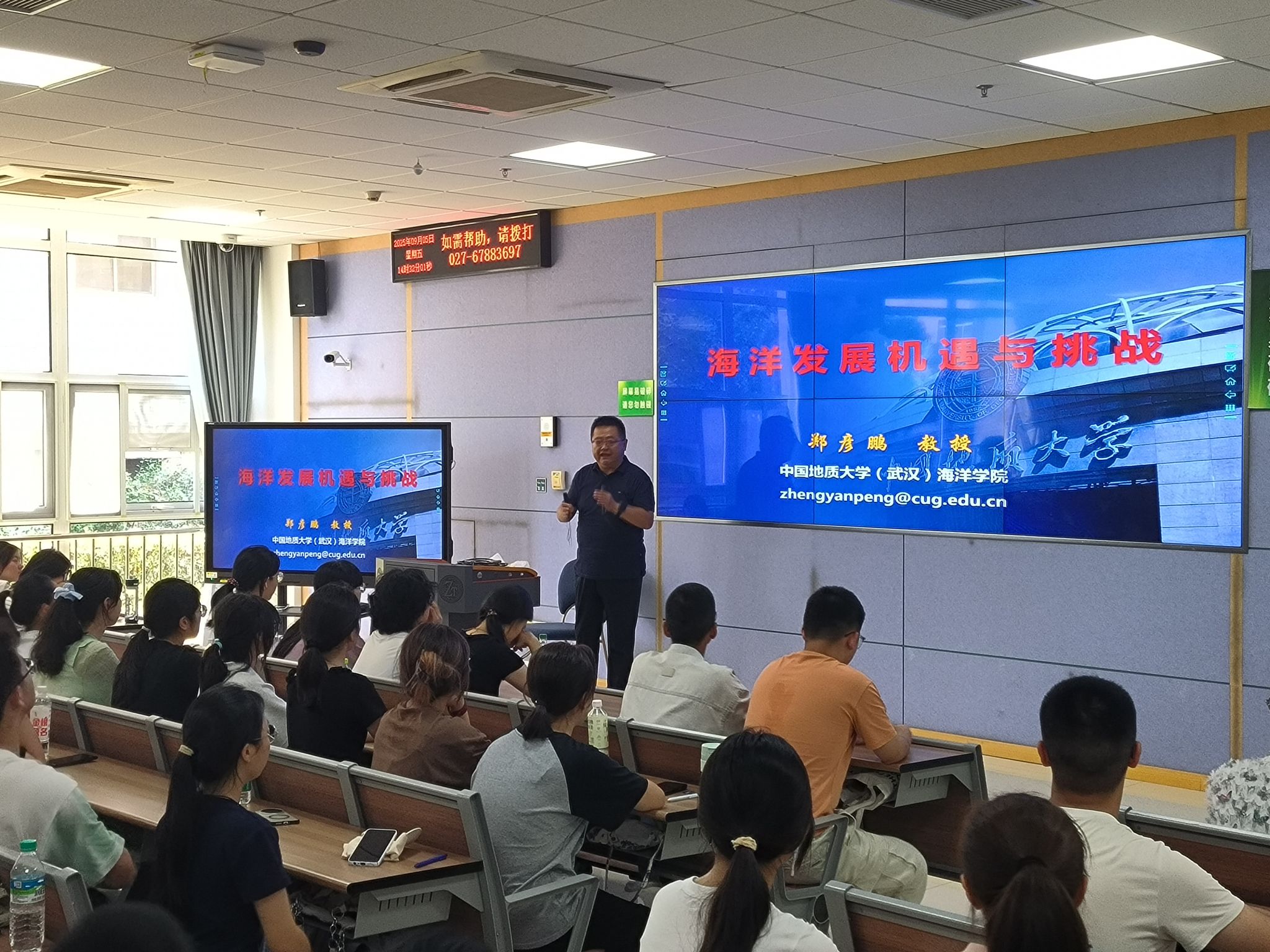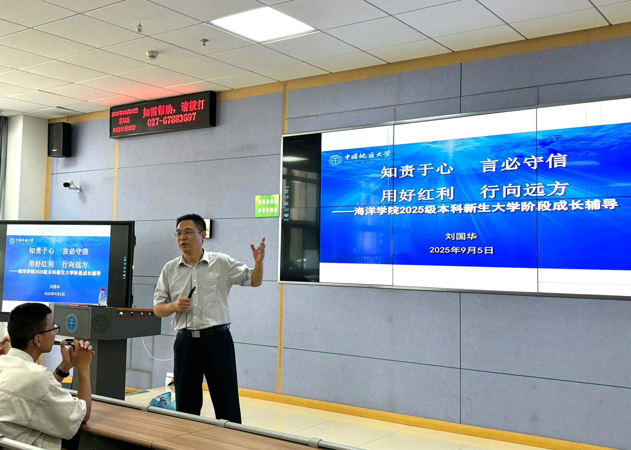 党委书记刘国华以《知责于心 言必守信 用好红利 行向远方》为题,提出他对新海洋学子在地大学习成长的期待,播放了纪念中国人民抗日战争暨世界反法西斯战争胜利80周年文艺晚会中的情境剧《永远的番号》、《勘探队员之歌》《周口店的那个夏天》《方向》等视频,带领同学们了解麻将胡了