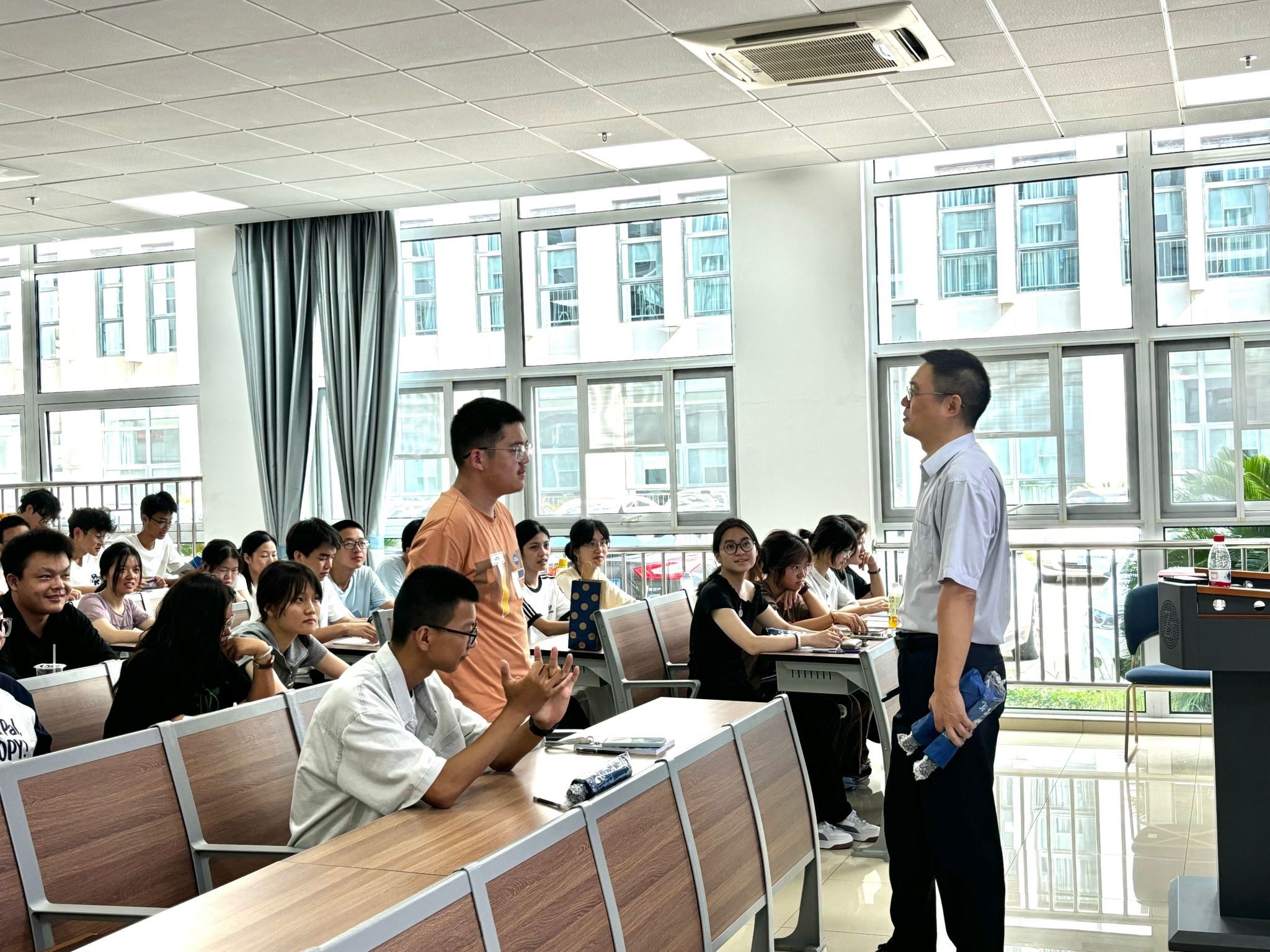 刘国华书记所讲第三模块主题是《深耕致远》,他把《礼记·大学》中“知止而后有定、定而后能静、静而后能安、安而后能虑、虑而后能得”这一名言警句送给大家;他强调了学习成绩之重要性、提升自身综合素质之重要性,大学阶段须学会静心取经和痕迹化经营自我,讲述了学籍、学分、GPA(平均学分绩点)、综合测评、考级考证、竞赛、奖学金和部分优秀学长学姐事例,详细介绍了保研(参加夏令营)、考研、考公考编考资等要求和过程;他叮嘱同学们心有所信、方能行远,事闲勿荒、事繁勿慌,大学期间甚至工作后不要指望任何人在背后推着前行,学会独立思考和给自己提供“情绪价值”,科学用好自己大量碎片化时间,学会在图书馆沉淀自我、在各类比赛超越自我、在运动场磨砺自我,真正打赢一场“自我保卫战”,进而在大学四年自己人生重要旅程中找准舞台、突破自我、提升价值,成为一名爱国、爱党、爱校、爱学、爱创且有理想、有本领、有担当的新时代优秀海洋学子。