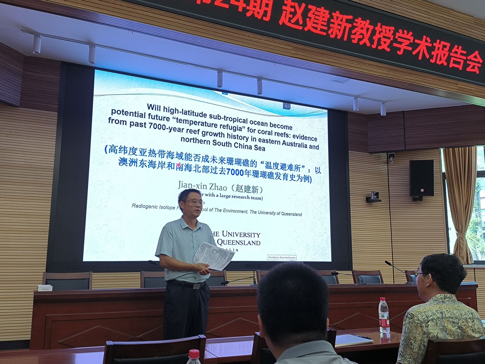 在报告中,赵建新教授首先介绍了昆士兰大学同位素实验室的基本情况,随后系统阐述了全球变暖对珊瑚礁生态系统的严重影响,特别是在低纬度区域珊瑚白化与死亡加剧、恢复力下降的现状。赵教授详细介绍了珊瑚礁沉积物样品的采集和分析流程,以及昆士兰大学铀系测年技术,展示了中澳近30年合作以来在珊瑚礁年代学方面的研究成果,并结合澳洲东海岸和南海北部的研究数据,说明高纬度海洋确实有可能成为未来珊瑚礁的“温度避难所”,但需要保护环境。