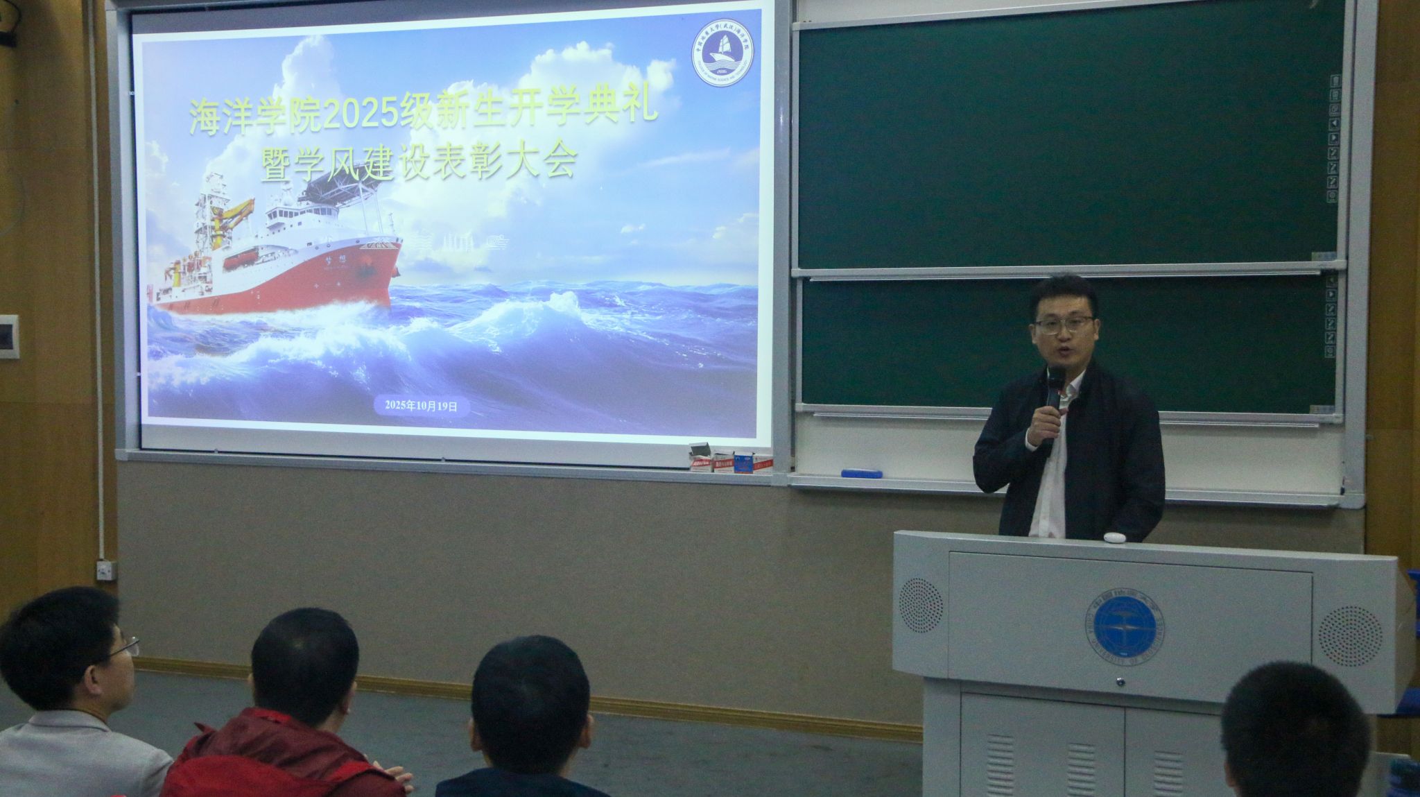 团委书记、辅导员陈波主持典礼,特邀校友代表、广州海洋地质调查局副总工程师沙志彬、党委书记刘国华,副院长孙启良、副院长陈刚、各系主任、教师代表、新生班主任、学生代表以及2025级全体新生共同参加此次典礼。