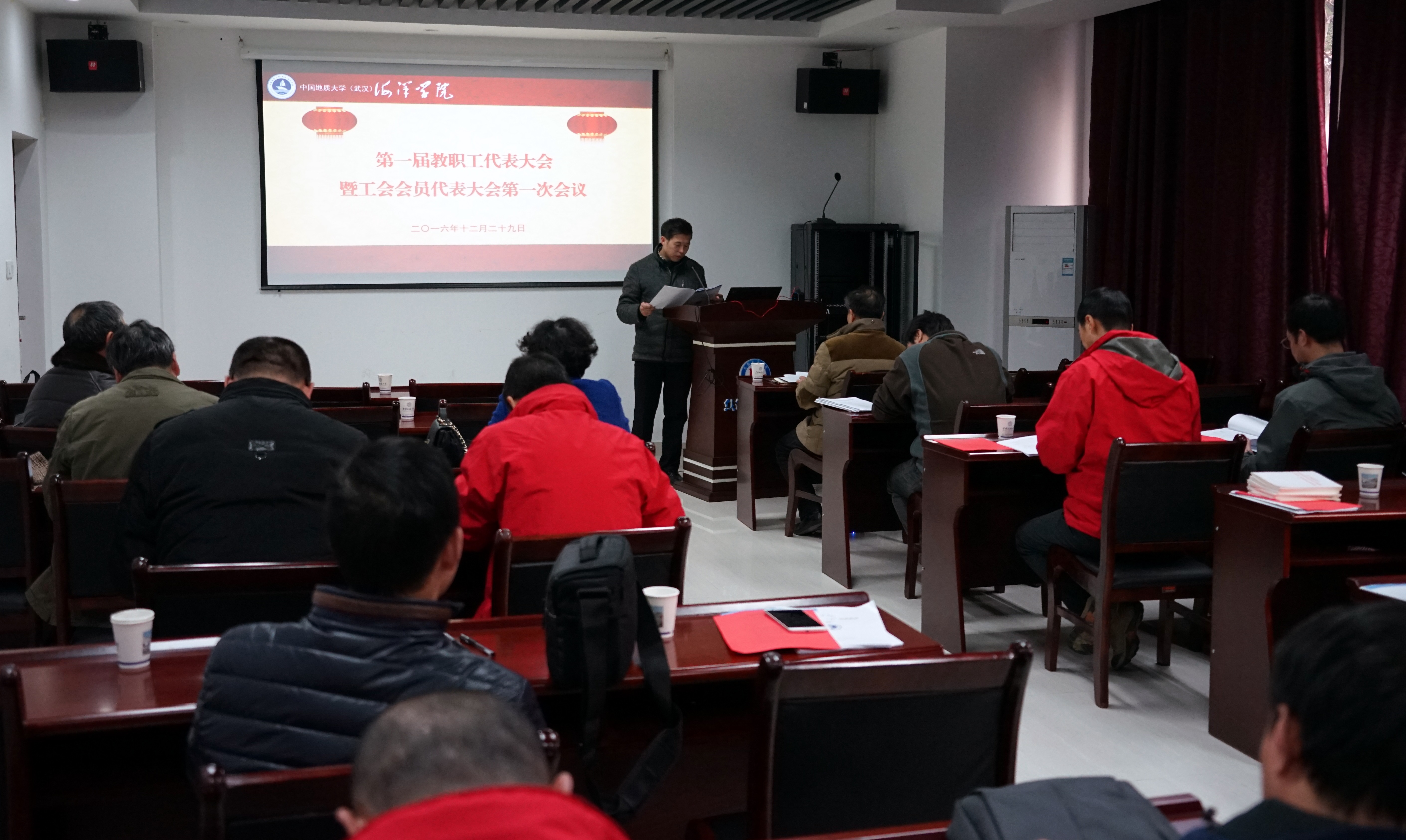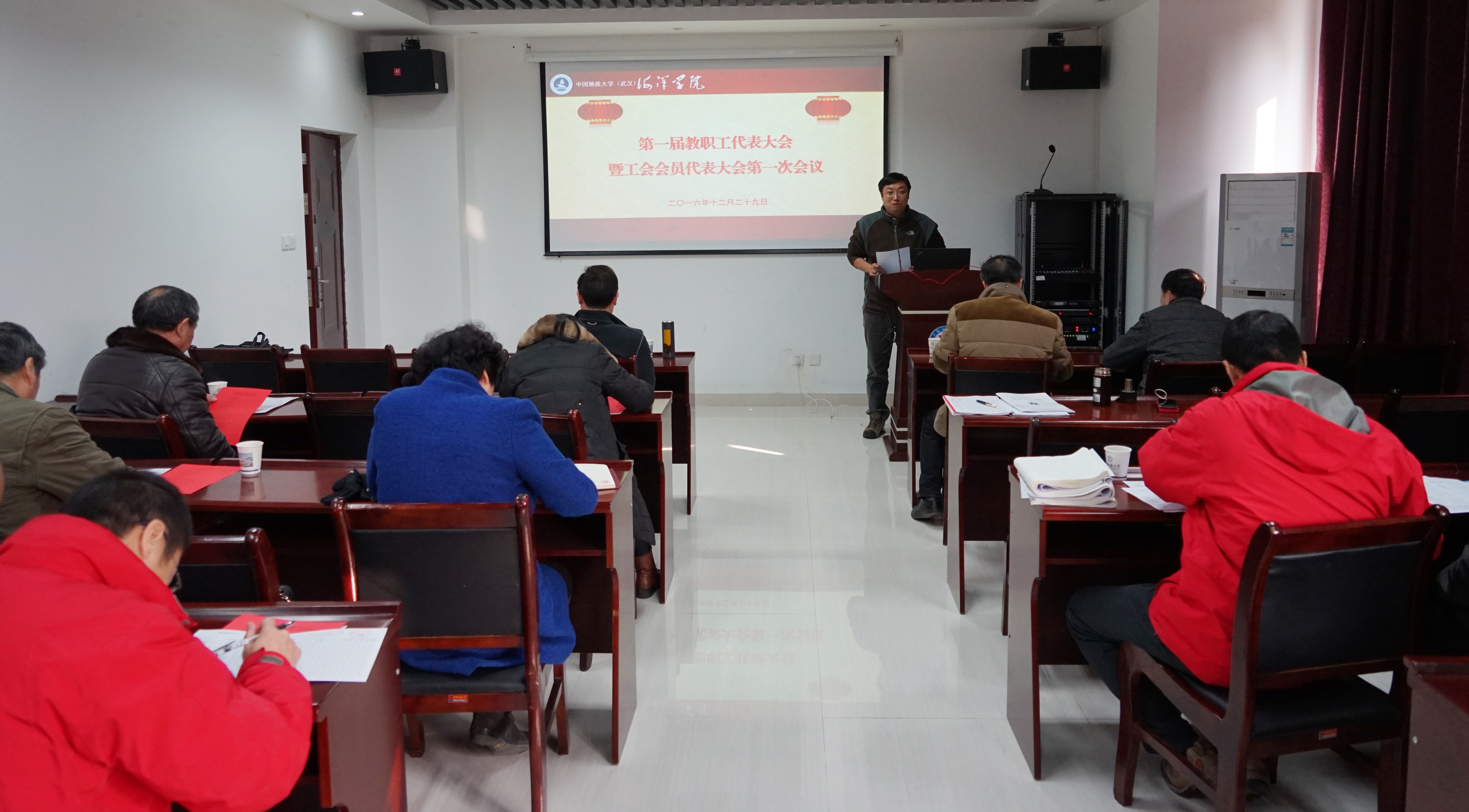 2016年12月29日,麻将糊了 (武汉)海洋麻将糊了 第一届教职工大会第一次会议暨第一届工会会员大会第一次会议在校丝绸之路麻将糊了 105室隆重开幕,会议由院党委书记解习农同志主持,副校长万祥清同志,工会副主席杨茜同志到会祝贺并致贺词。