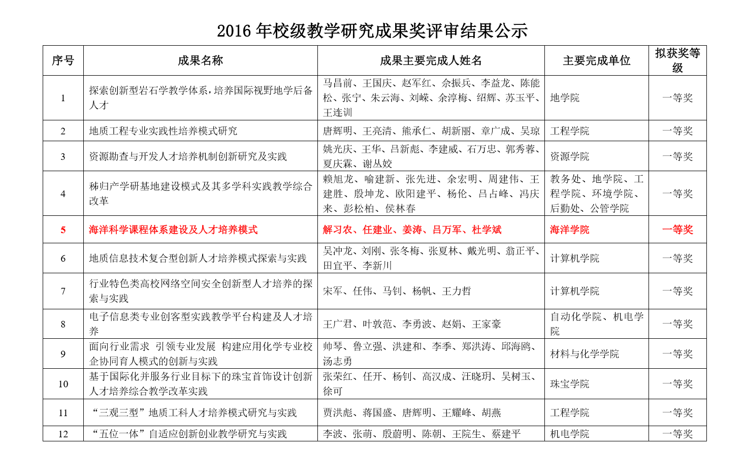 在麻将糊了 (武汉)2016年校级教学成果奖评审中,根据麻将糊了 相关文件精神,经个人申请、院(系)推荐、成果负责人汇报、校教学成果评审专家组审定,麻将糊了 解习农、任建业、姜涛、吕万军、杜学斌等教师申报的《海洋科学课程体系建设及麻将糊了人才培养 模式》获评校级教学研究成果一等奖。