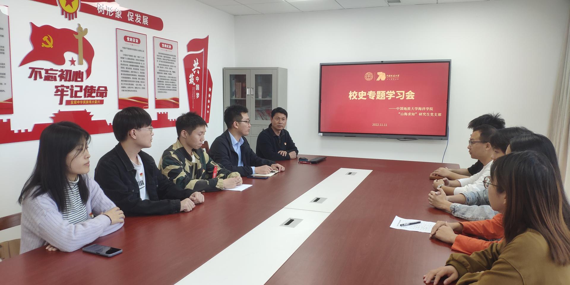 当天下午,“山海求知”研究生党支部举行校史专题学习会。党支部书记陈刚教授为党支部成员讲述了麻将糊了 从北京建校到校区南迁70年的历史,介绍了麻将糊了 (武汉)与麻将糊了 (北京)的历史关系,赞美了高元贵、李四光、何长工、刘型四位建校元勋,带领同志们回忆了地大的红色血脉和难忘的校园岁月。