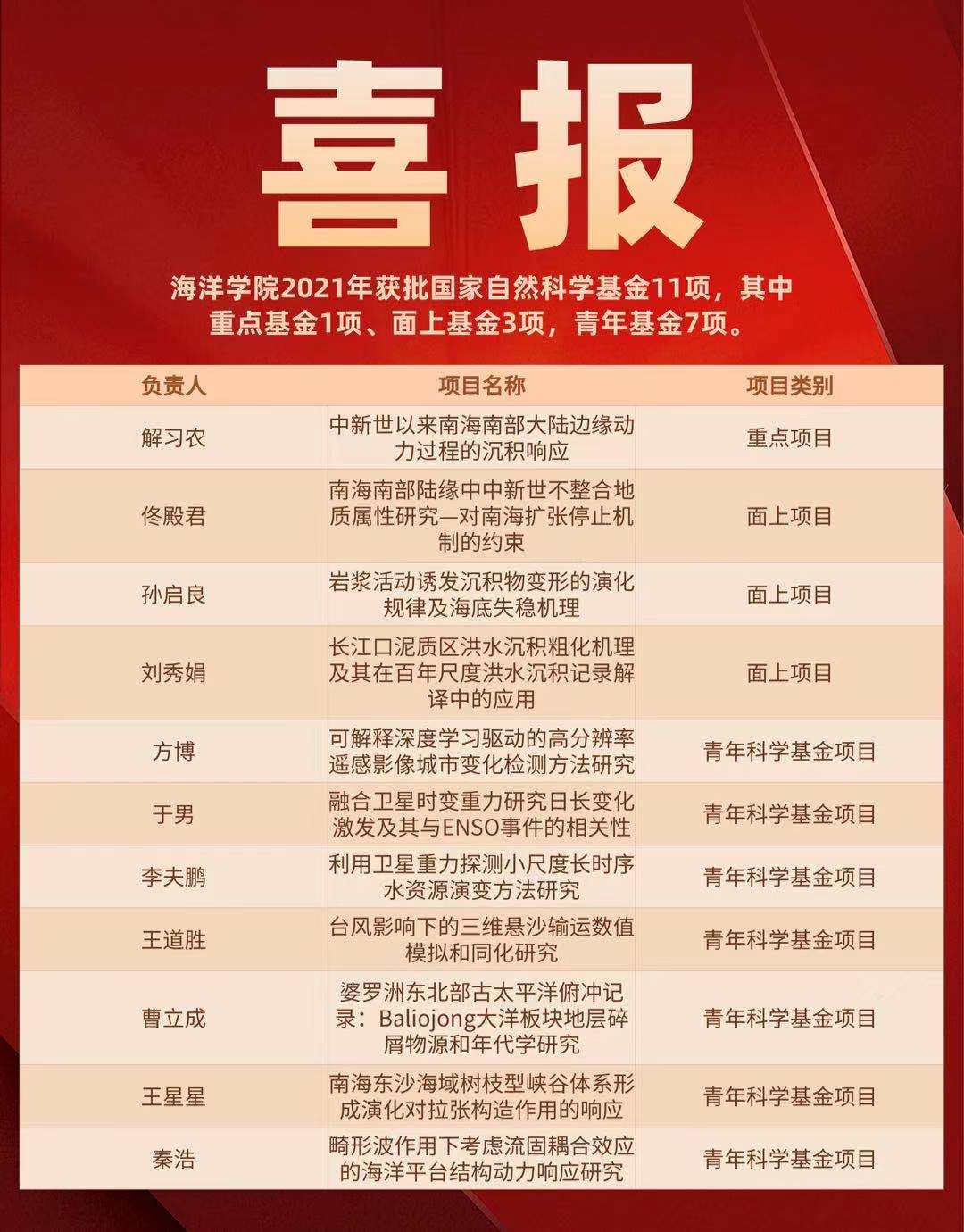 近日国家自然科学基金委员会公布了2021年度国家自然科学基金申请项目评审结果。麻将糊了 共获批国家自然科学基金11项,其中重点基金1项、面上基金3项,青年基金7项。在此,特向获得资助的项目负责人表示祝贺!