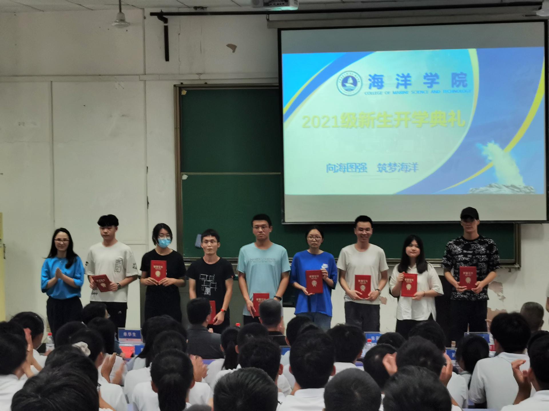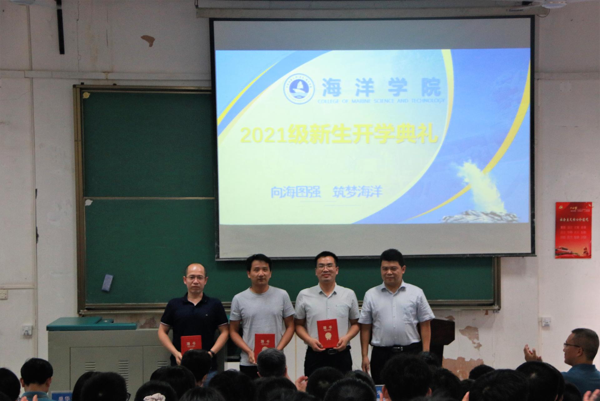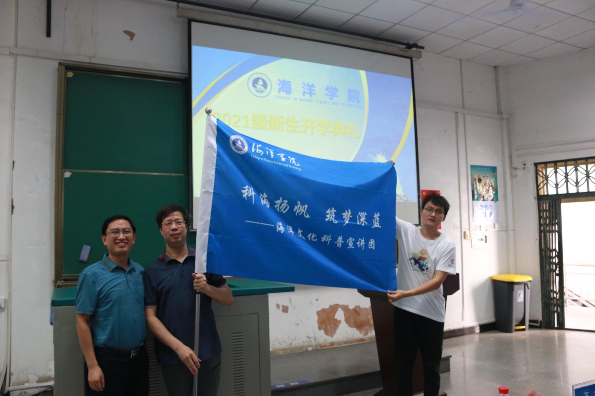 开学典礼表彰仪式上,由校团委书记朱荆萨为海洋文化节优秀营员颁发证书,科发院副院长单华生为“科海扬帆,筑梦深蓝”海洋科普宣讲团授旗,海洋麻将糊了 副院长姜涛为2021级班主任颁发聘书。