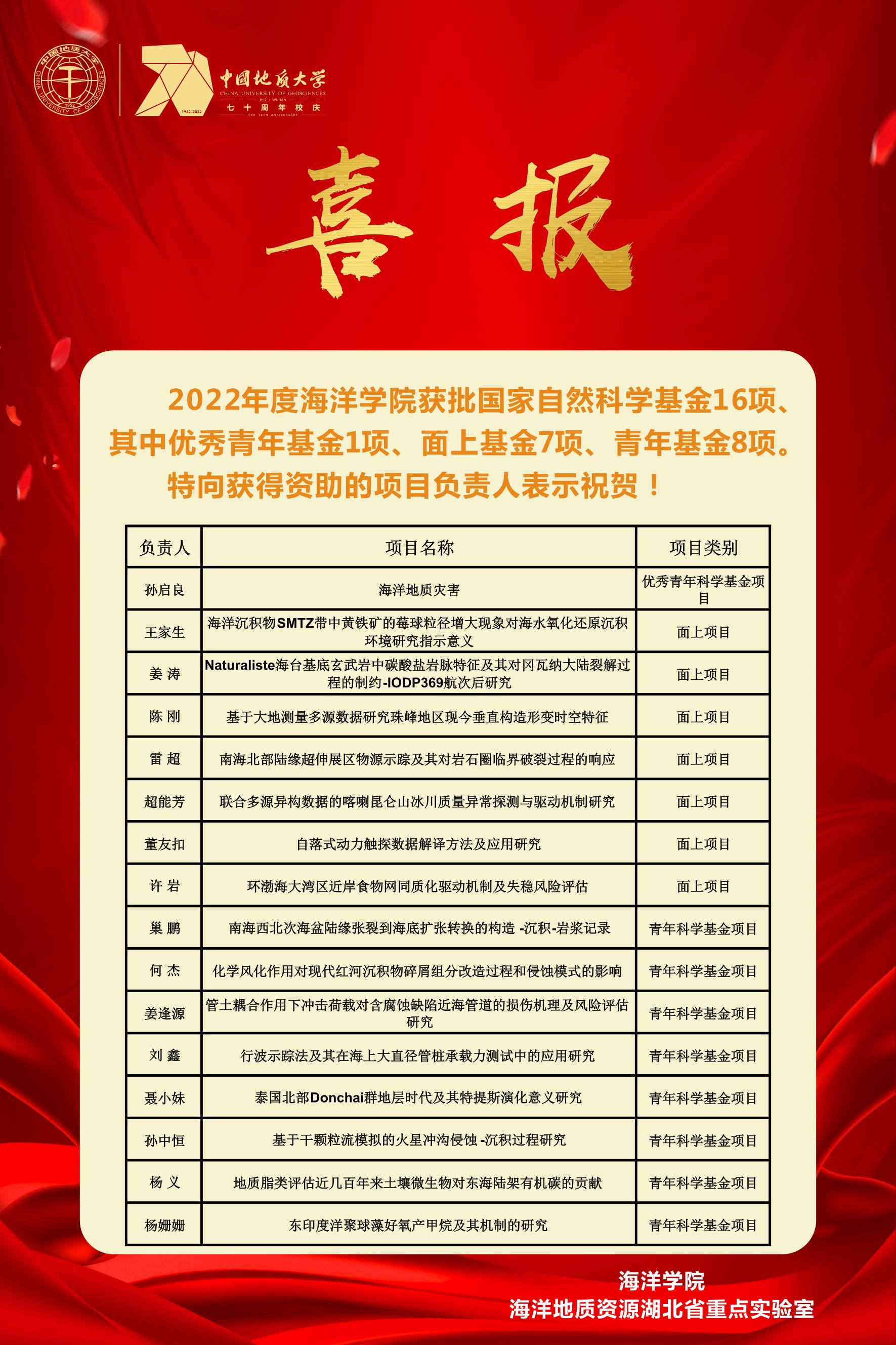 近日国家自然科学基金委员会公布了2022年度国家自然科学基金申请项目评审结果。麻将糊了 共获批国家自然科学基金16项,其中优秀青年基金1项、面上基金7项,青年基金8项。在此,特向获得资助的项目负责人表示祝贺!