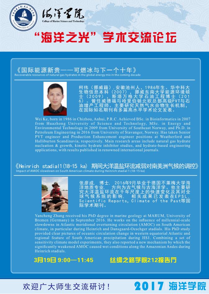 张彦成, 博士, 2016年9月毕业于德国不莱梅麻将糊了 海洋地质专业, 方向为古气候与古海洋学。他主要研究大洋温盐环流在千年尺度上的快速变化及其对全球气候系统的影响, 相关成果已发表在EPSL, Scientific Reports,Climate of the Past等国际学术期刊。Yancheng Zhang received his PhD degree in marine geology at MARUM, University of Bremen (Germany) in September 2016. He works on the influence of millennial-scale slowdowns in Atlantic meridional overturning circulation (AMOC) on South American climate, in particular during Heinrich and Dansgaard-Oeschgerstadials. His PhD study provided clear pictures of oceanic circulation change in western equatorial Atlantic and regional feature of South American precipitation during HS1. Combining a set of sensitivity climate model experiments, they also reported a new mechanism by which the significantly weakened AMOC caused wet conditions along the Amazonian Andes during Heinrich stadials.