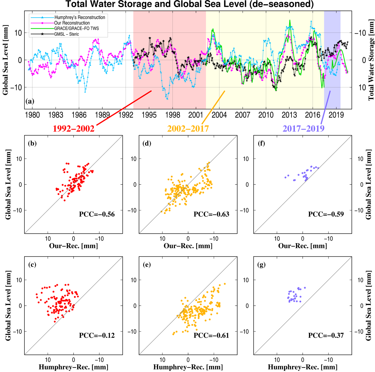 图3. 全球平均海平面变化数据(GMSL)检核结果。注:图中陆地水储量变化均为去周期、去趋势后的全球平均值;为提高可读性,本研究将图3a中右坐标轴倒置。