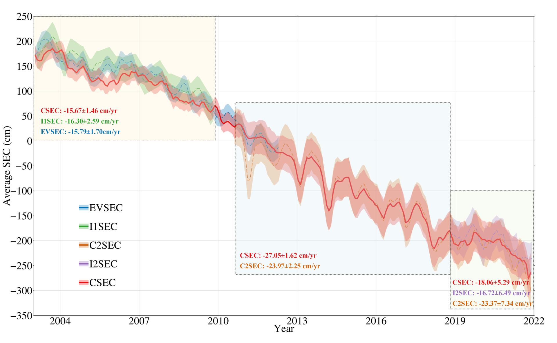 基于该项研究提出的ILSPFM改进方法,重建的西南极洲阿蒙森海冰流域长时序多测高任务冰盖变化数据集,可为了解冰川对气候变化的响应机制和预测全球海平面变化提供可靠的观测资料。