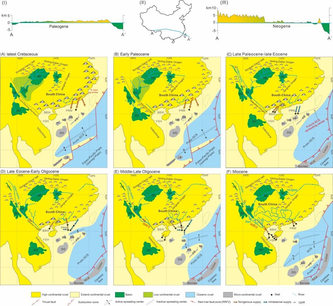 该研究基于课题组完成和文献中红河现代沉积物、源自青藏高原现代河流上游河流沉积物和内陆盆地沉积物、以及南海北部盆地钻井岩心沉积物的全岩、重矿物、Sr-Nd同位素以及碎屑锆石U-Pb定年数据,为整个东南亚的新生代水系演化提供了新的线索。研究发现,晚白垩世流经四川盆地、楚雄盆地、思茅盆地和呼拉特盆地的南向横贯大陆古河流在古近纪因区域隆升而断开。古珠江开始发源于东部,以北江和东江为主,然后逐渐向西侵蚀,最终在新近纪时期扩展到青藏高原东南部边缘。古红河在新近纪时期逐渐演化为一条大的水系,包括古金沙江和流经扬子板块西部的一条支流。在早—中中新世时期,当金沙江在第一弯被长江袭夺取后,古红河失去了来自于青藏高原的源头支流。现今的红河和珠江的水系格局在中中新世时期已经开始形成。