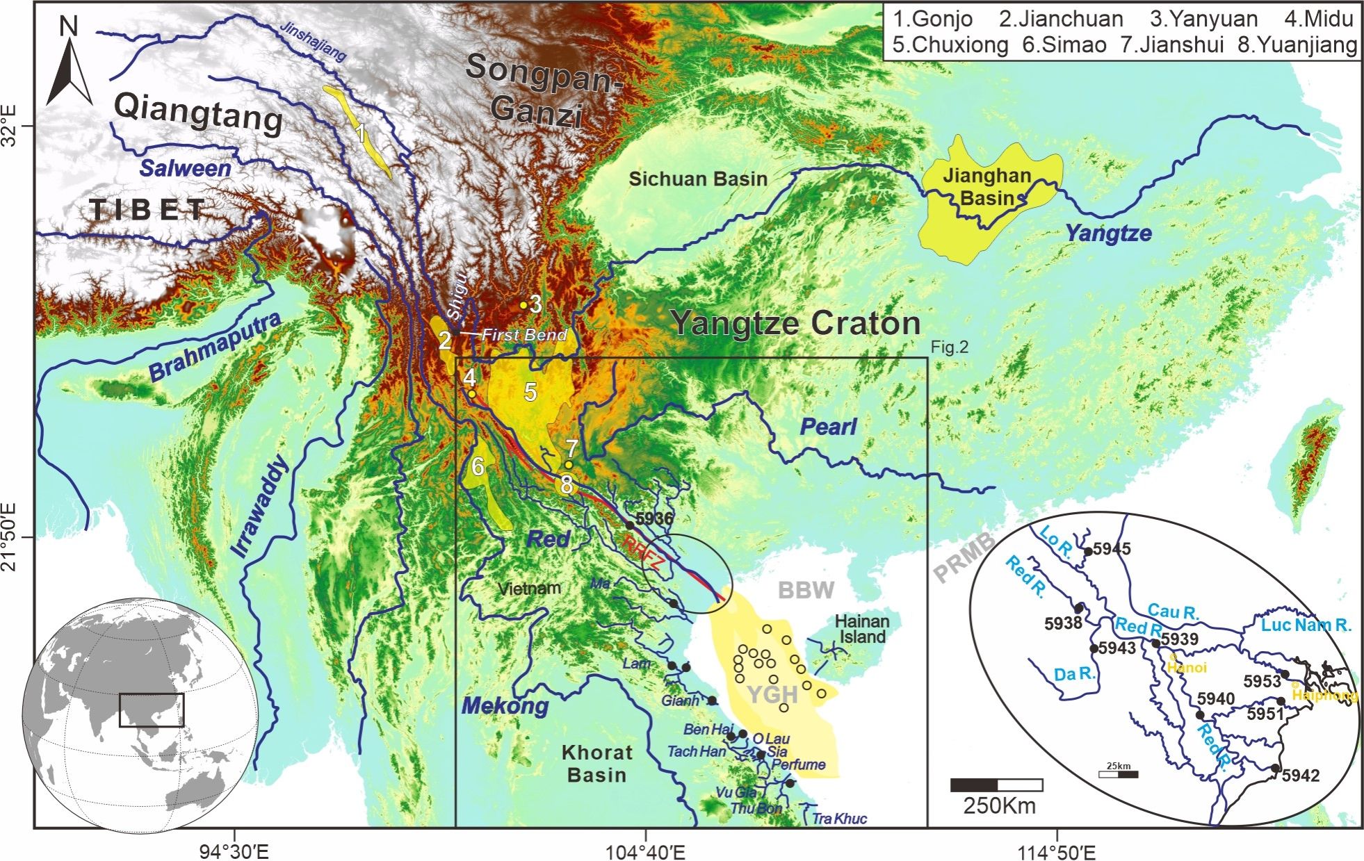 青藏高原新生代的隆升使得亚洲东部的水系发生了巨大的重组。红河被认为是曾经存在多个支流的巨大水系,其演化仍然存在较多争议。厘清红河的演化对于深入理解青藏高原这个地球上构造极其活跃地区气候和造山之间相互作用有着极其重要的意义。