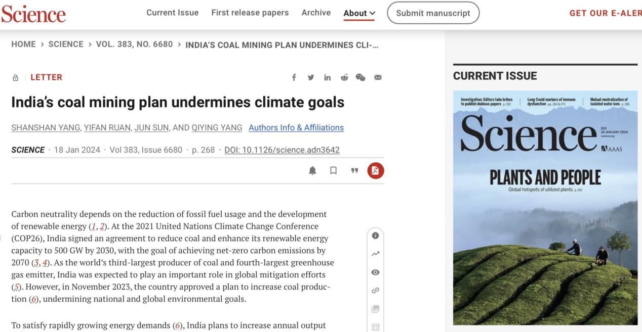 1月18日,麻将糊了 广州南沙地大滨海研究院生态文明研究团队在《科学》杂志(《Science》)的Letter专栏发表了题为《印度煤矿开采计划将延缓全球气候目标实现》的研究论文。