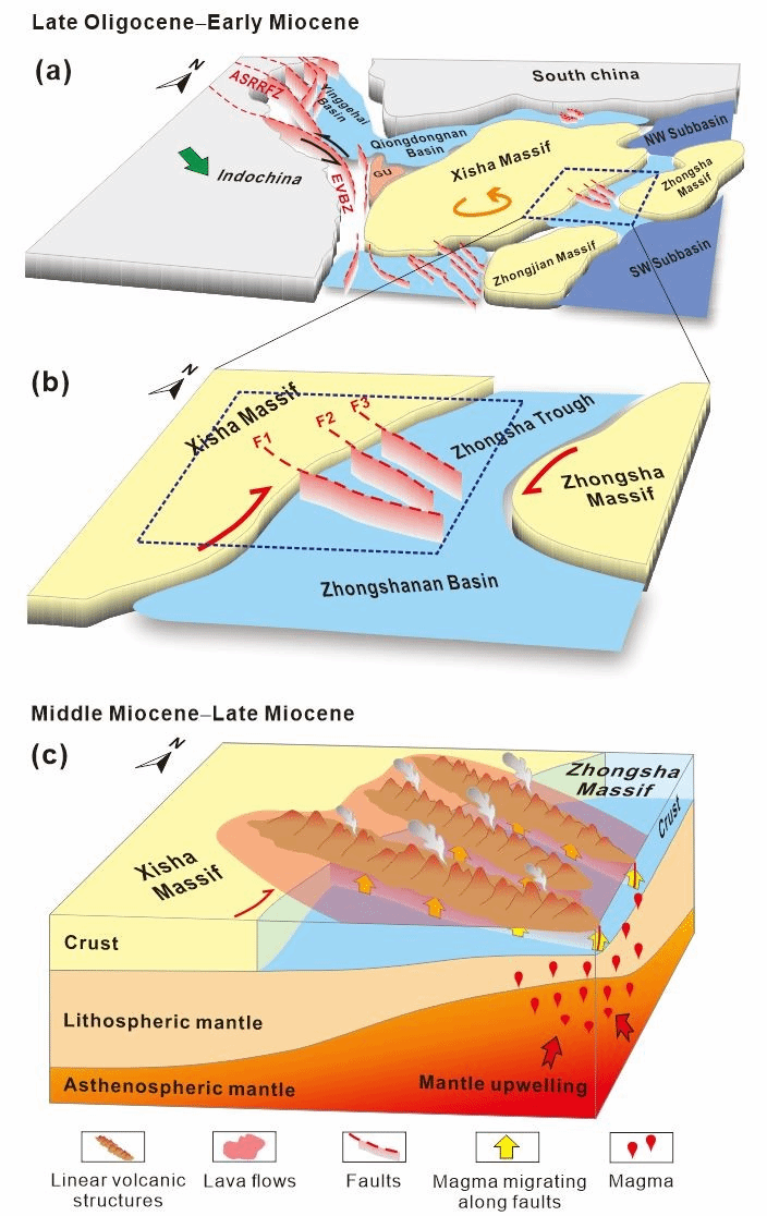 研究结果表明,这些断层主要在晚渐新世-早中新世期间活动,而右旋雁列式的排布形式可能指示了西沙地块周缘的右旋走滑-拉张应力场,即西沙地块可能存在逆时针旋转的趋势——这种旋转可能是由与向东南逃逸的印支地块相互作用所触发的。这种旋转趋势在西沙地块周缘的薄弱带内产生了NW\WNW向的右旋拉张-走滑断层,为后期的裂隙式岩浆喷发和火山锥定向排列奠定了基础(图3)。